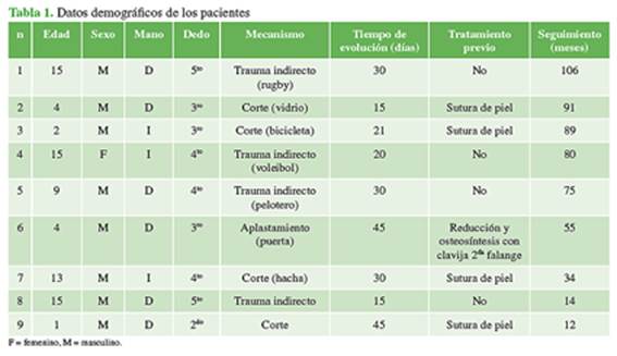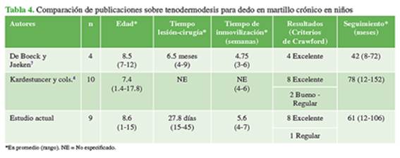 Se han publicado muchos resultados de la técnica de tenodermodesis en la población adulta.1,2,6,9,13,16-19 Sin em-bargo, se dispone de escasa información en pacientes