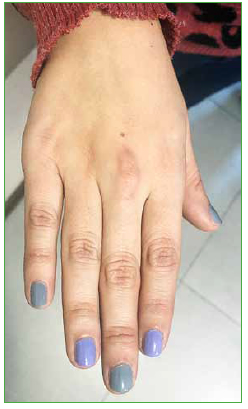 más evidente (Figura 1). Además, aparecieron (o se incrementaron de tamaño) otros nódulos en manos y codos