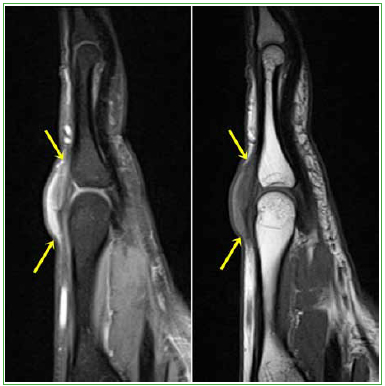 El examen de las otras regiones también mostró tumoraciones fusiformes en los tendones extensores del tercer dedo (Figuras 5 y 6) y el tríceps (Figuras 7 y 8), en forma bilateral.