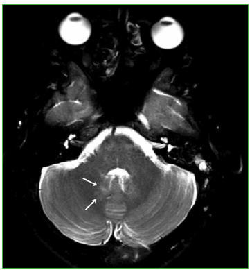La RM de cerebro reveló anomalías menores en la fosa posterior (Figura 9), sin alteraciones evidentes en el compartimento supratentorial (lo que coincide con los escasos síntomas neurológicos de esta paciente). La RM de columna fue normal.