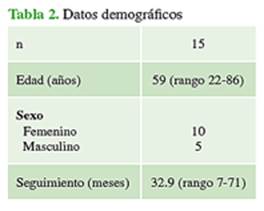 analizaron 15 pacientes (10 hombres) con una edad promedio de 59 años y un