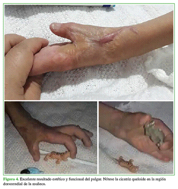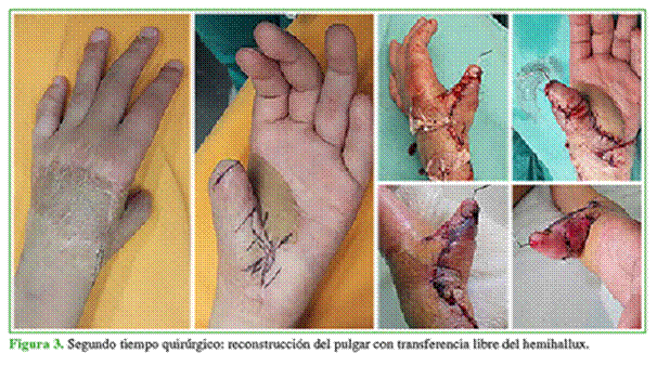en la reconstrucción de la primera comisura con colocación del pulgar en una