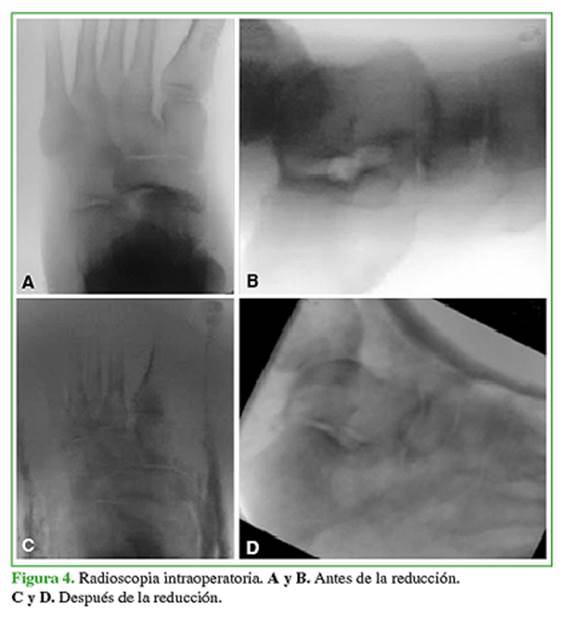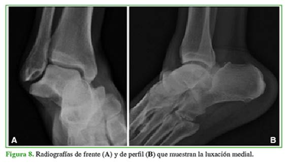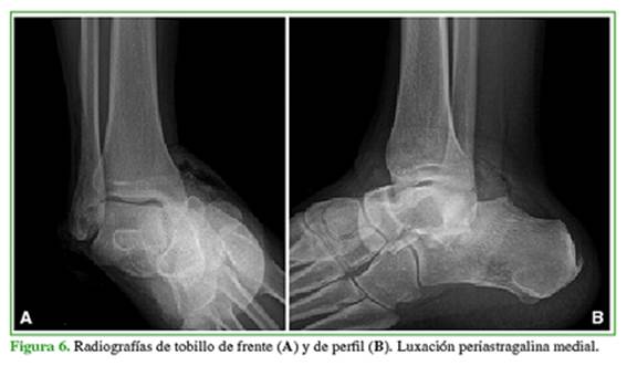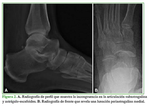 Las radiografías revelaron una luxación periastragalina medial, con evidente incongruencia de las