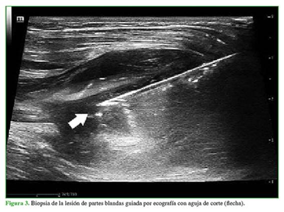 blandas, se solicita una biopsia de la masa de partes blandas (Figura 3), con