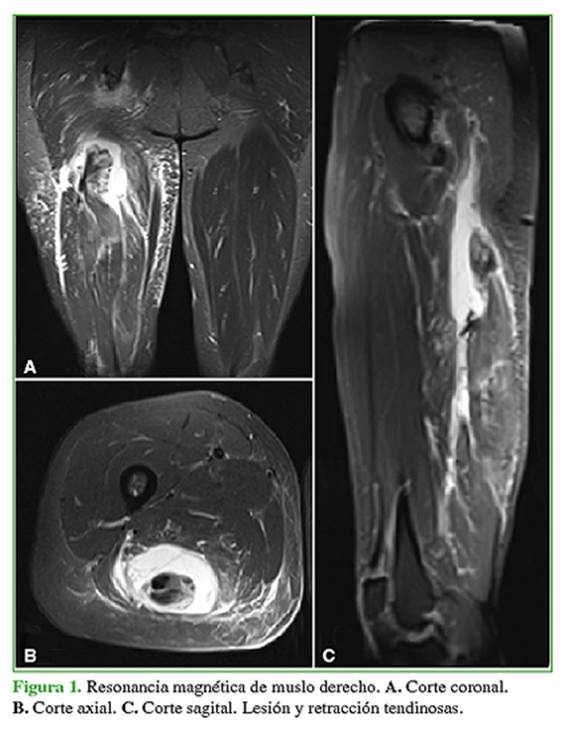 realiza una resonancia magnética (RM) que muestra una desinserción proximal de isquiotibiales con retracción de aproximadamente 50 mm. Se indica reparación quirúrgica.