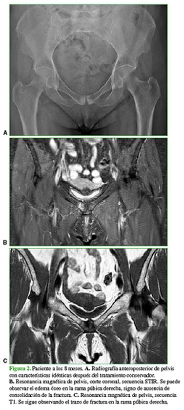 fractura por estrés del pubis, que no respondió al tratamiento conservador y
