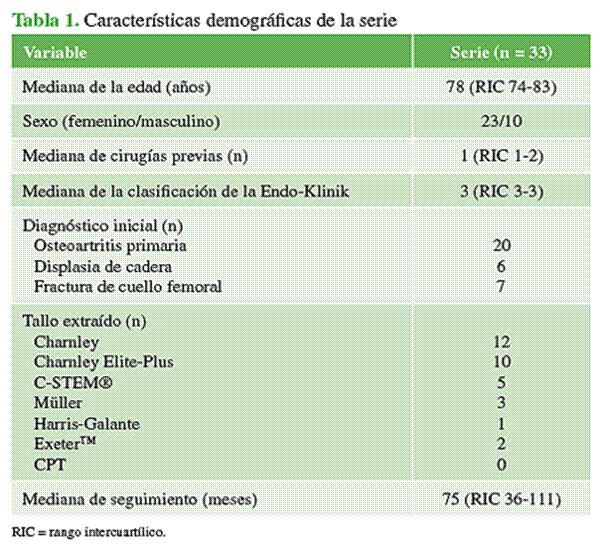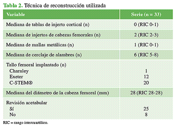 (RIC 74-83). La mediana del defecto óseo femoral fue 3 (RIC 3-3) según la
