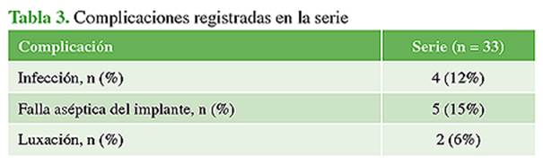 registraron cinco fallas asépticas del implante y dos luxaciones en toda la
