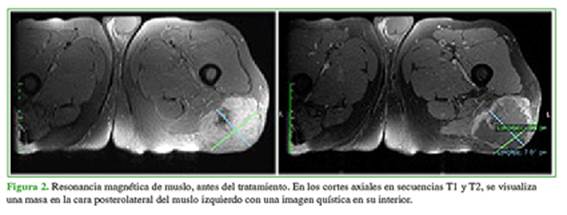 resonancia magnética de muslo izquierdo, se visualiza una masa en la cara