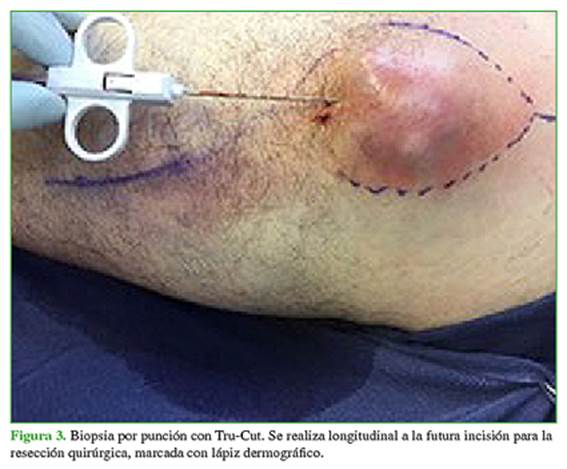 efectuó una biopsia por punción percutánea con Tru-Cut en sentido longitudinal,
