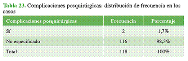Complicaciones posquirúrgicas: no se especificaron en el 98,3% de los casos, por