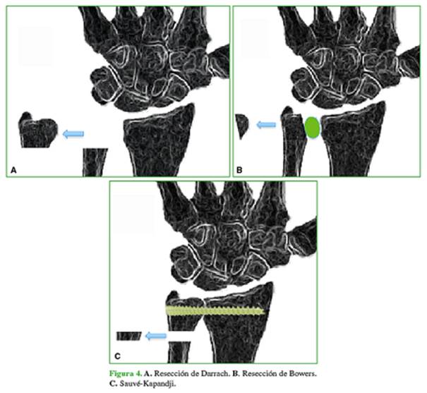 Darrach, Sauvé-Kapandji, Bowers, o una prótesis radiocubital distal. Estas