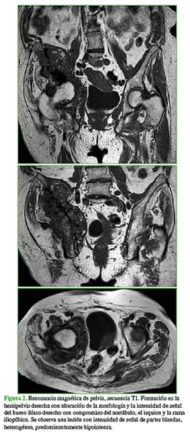 resonancia magnética (Figura 2), se observó una formación en la hemipelvis