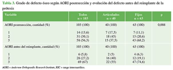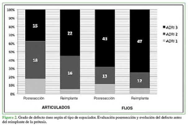 progresión de los defectos óseos AORI 1 y 2 hasta el momento del reimplante fue