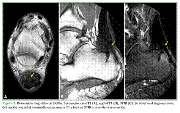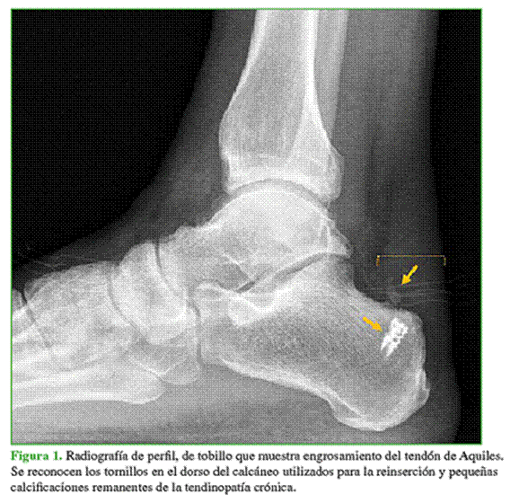 radiografía, se observa un tendón de Aquiles engrosado con elementos de