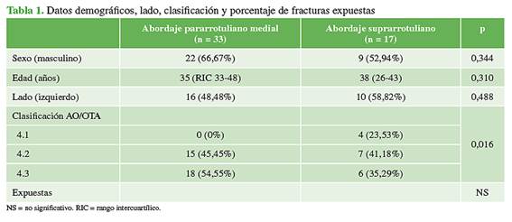 clavo endomedular a través del abordaje pararrotuliano medial (n = 33) y
