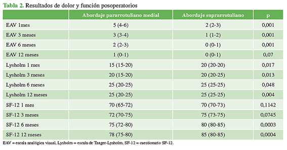 suprarrotuliano (n = 17). Se evaluaron el dolor de rodilla posoperatorio con
