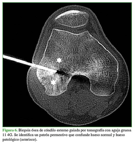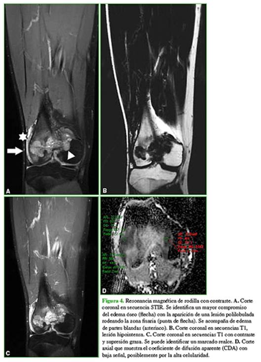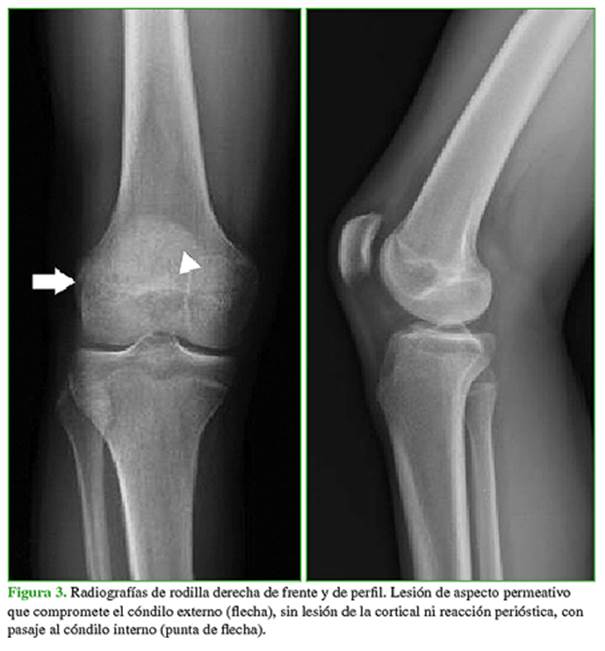 En la radiografía, se identifica un patrón permeativo, con marcado compromiso del cóndilo externo y,