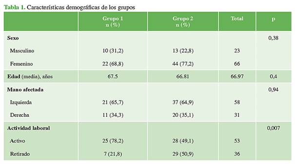 características demográficas registradas fueron: sexo, edad, mano afectada,