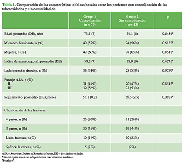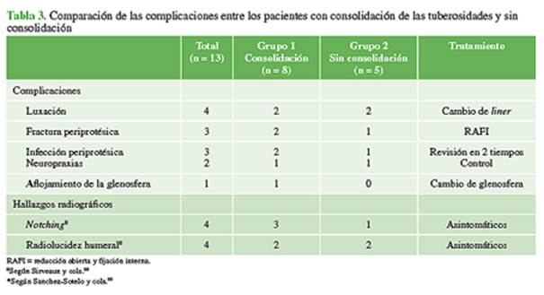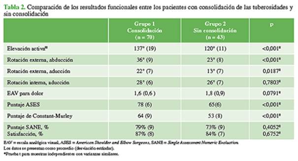 hombro. Setenta presentaron consolidación anatómica de las tuberosidades y 43,