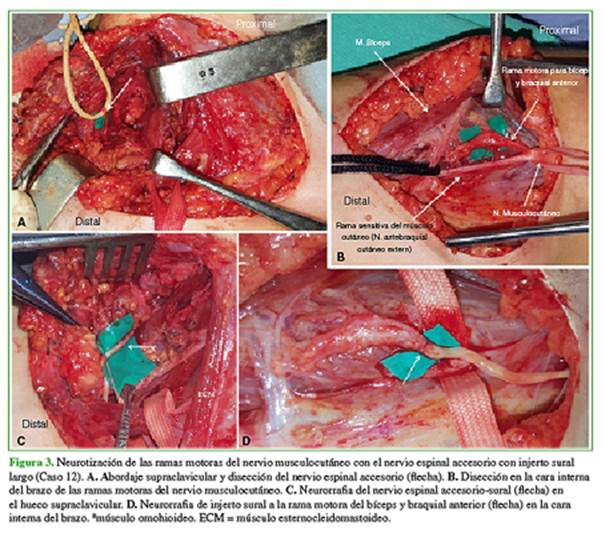 musculocutáneo sin injerto (3 pacientes), nervio espinal accesorio a ramas