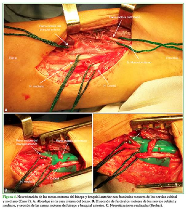 motoras del nervio musculocutáneo con injerto sural (2 pacientes), fascículos