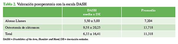 olécranon en 12 casos (63%). El puntaje DASH promedio fue de 11,31, lo que