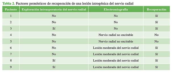 nervio radial. Sugerimos la exploración del nervio en estos casos.