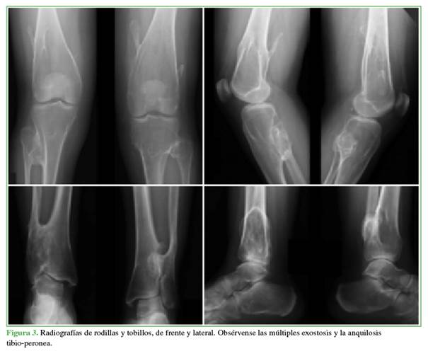 tobillos, se visualizaban las múltiples exostosis y una anquilosis tibio-peronea (Figura 3).