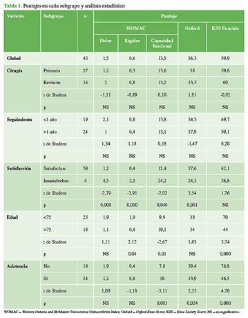 una misma institución, por el mismo equipo quirúrgico, entre 2015 y 2022. Resultados: Los resultados en las escalas de función WOMAC, KSS y