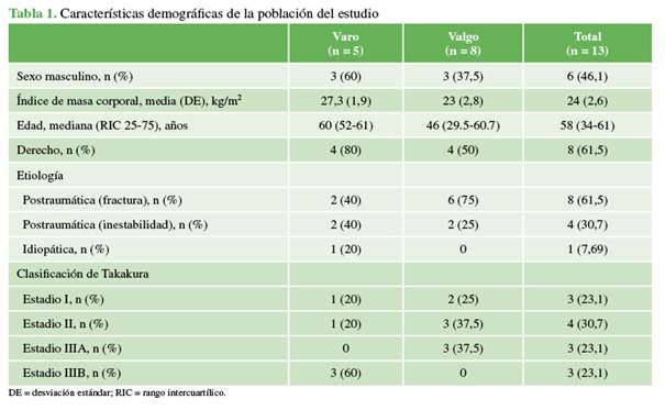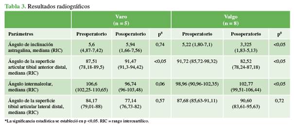 y radiográficos preoperatorios y posoperatorios. Resultados: Se incluyó a 13 pacientes que se habían sometido a una
