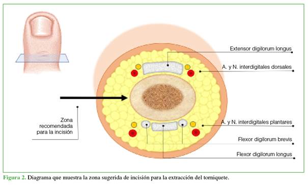una hoja de bisturí N.° 11, en la región dorsomedial (Figura