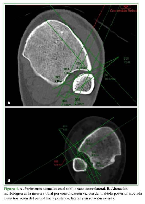 comparativas de los tobillos operado y sano. Resultados: Se evaluaron 13 fracturas. Los parámetros radiográficos