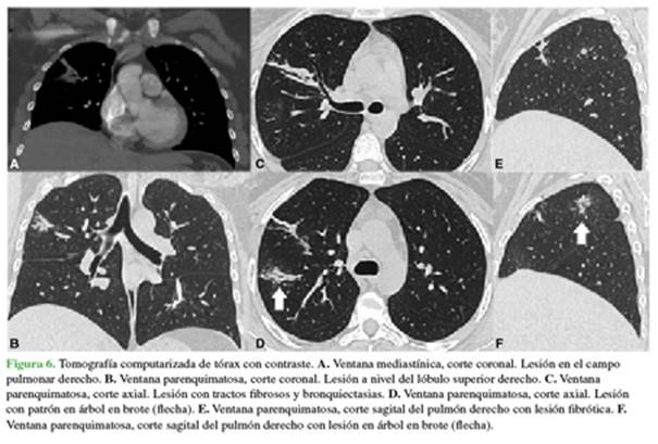 pulmonar derecho superior, con tractos fibrosos y bronquiectasias asociadas con