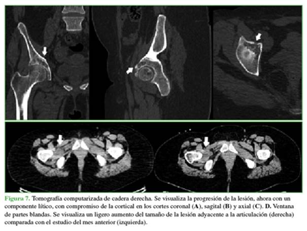 en el sector anterosuperior del acetábulo derecho (SUVmáx. 14,2). Se acompañaba