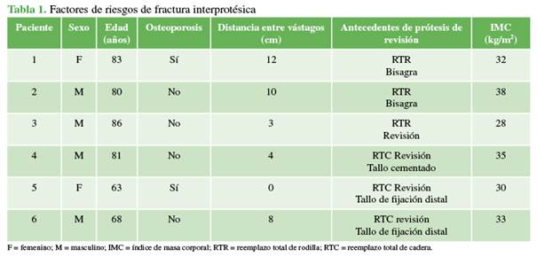 Algunos de los factores de riesgo publicados son: edad avanzada, artroplastia de revisión, tallos no cementados, artritis reumatoide, distancia entre vástagos <11 cm, osteoporosis, obesidad y sexo femenino.4 Estos tipos de fracturas se clasifican según el sistema de Pires y Platzer.5-7