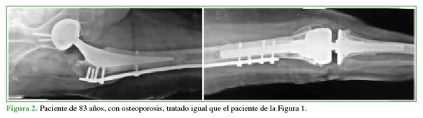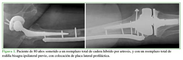 Tres pacientes habían sido sometidos a un reemplazo total de cadera; en dos casos, con una prótesis híbrida primaria y el tercero, con una prótesis de revisión con tallo cementado, todos ellos tenían implantes de rodilla ipsilateral, con vástagos cementados (Figuras 1 y 2). Además del implante de cadera, a todos se les agregó una placa de osteosíntesis lateral en forma profiláctica. El HHS previo era de 45 (rango 42-48) y el posoperatorio fue de 80,33 (rango 79-82).
