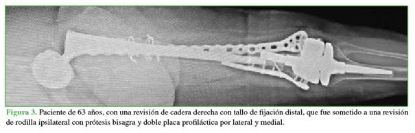 A los restantes 3 pacientes de la muestra se les realizó una revisión de la prótesis de rodilla; en dos casos, con una prótesis de bisagra con vástagos cementados y el otro con una prótesis estabilizada intercondílea con vástagos cementados. Estos pacientes tenían implantes de cadera ipsilateral en el momento de la revisión de rodilla; todos de revisión, un tallo era cementado y los otros dos, tallos de fijación distal no cementados. A dos pacientes, en el mismo acto quirúrgico de la revisión de rodilla, se les colocó una doble placa profiláctica, por lateral y de sostén, por medial (Figura 3).