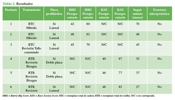 En nuestra cohorte, la tasa de supervivencia sin FIPF fue del 100% durante el seguimiento, no se produjeron complicaciones quirúrgicas ni alteraciones en el protocolo de rehabilitación. Además, los resultados funcionales evaluados mediante el HHS para cadera y el KSS para rodilla fueron satisfactorios, con mejoría clínica en todos los casos.