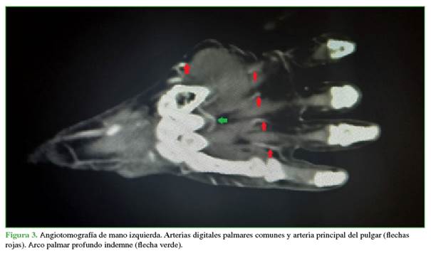 La embolización distal de las arterias digitales exacerba la isquemia,1,7 fenómeno descrito hasta en el 50% de los