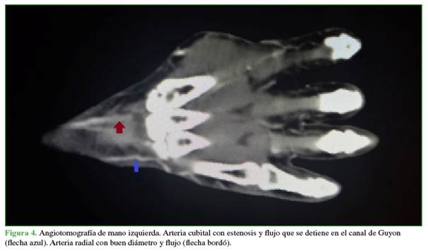 the absence of vascularization in the ulnar artery, and thrombosis was verified by Doppler ultrasound and angiotomography. The