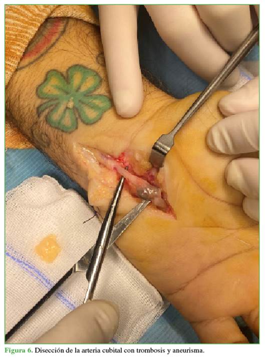 postraumática de la arteria cubital a nivel distal, detectada en una operación,