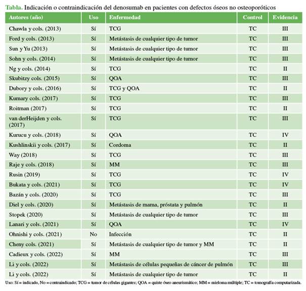 indicaban o contraindicaban el uso del denosumab. Conclusiones: El denosumab está indicado como una buena opción de