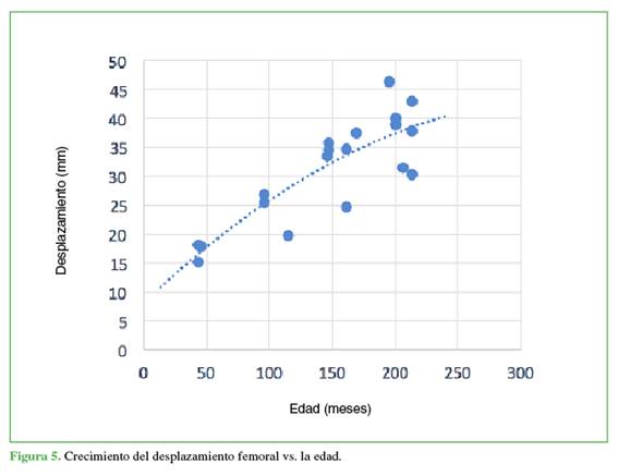 femoral, diámetro de la cabeza femoral y ángulo cervico-diafisario. Resultados: El desplazamiento femoral aumenta 1,96 mm hasta los 12.5