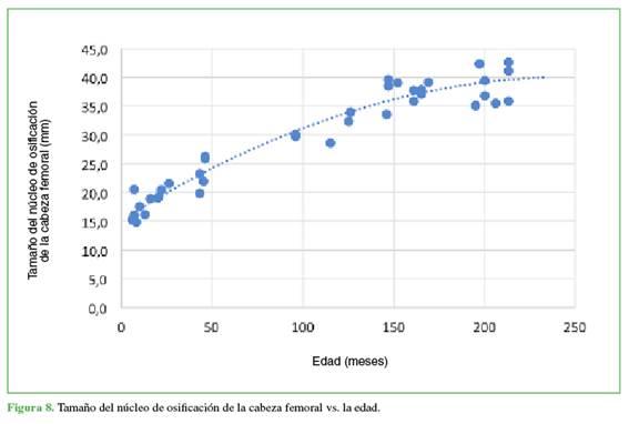 cabeza femoral de 1,56 mm hasta los 13 años y de 0,62 mm anuales, en adelante. Conclusiones: Las medidas descritas en este estudio son esenciales para