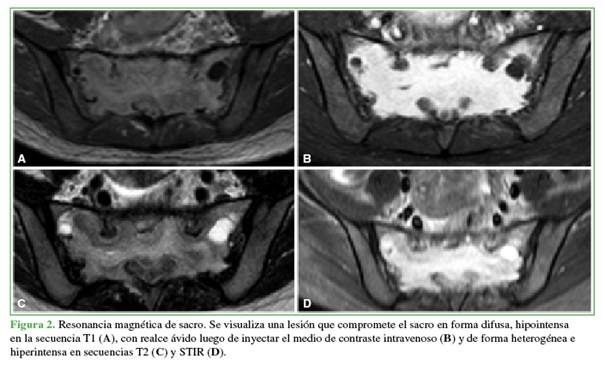 una lesión que comprometía el sacro de forma difusa, hipointensa en la