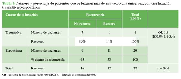 luxación, considerando los diferentes factores que pueden influir en ella. Resultados: