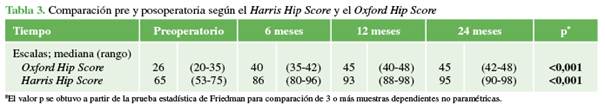 promedio fue de 47 meses (rango 36-86). Para la evaluación se utilizaron el Harris Hip Score, el Oxford Hip Score y radiografías de ambas