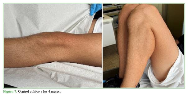 rango de movilidad completo, sin dolor, y la carga era total (Figura 7). A los 6 meses, retomó su actividad física habitual y no