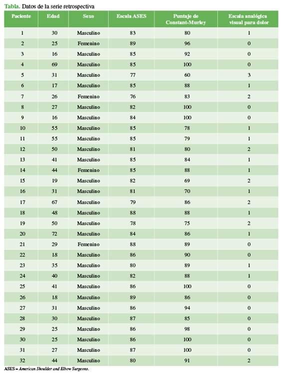 puntaje promedio de Constant-Murley modificado fue de 88,34; el puntaje ASES,